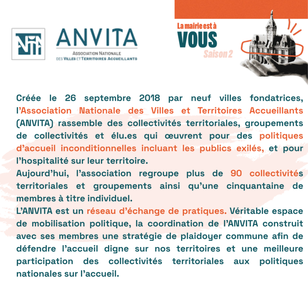 Dans le cadre de son plan d’action Maires Accueillant·es, l’ANVITA propose un nouvel outil à destination de ses membres, de ses partenaires et des futur·es candidat·es souhaitant porter un projet d’accueil et d’inclusion des personnes exilées sur leur commune : le Manuel pour un mandat accueillant. 📆 2 octobre à 11h🔗 Lien d’inscription Ce webinaire proposera une présentation de l’outil, avec l’intervention d’élu·es y ayant contribué, et d’une discussion autour de sa prise en main en particulier dans le cadre de campagne de plaidoyer local en vue des élections municipales 2026 |